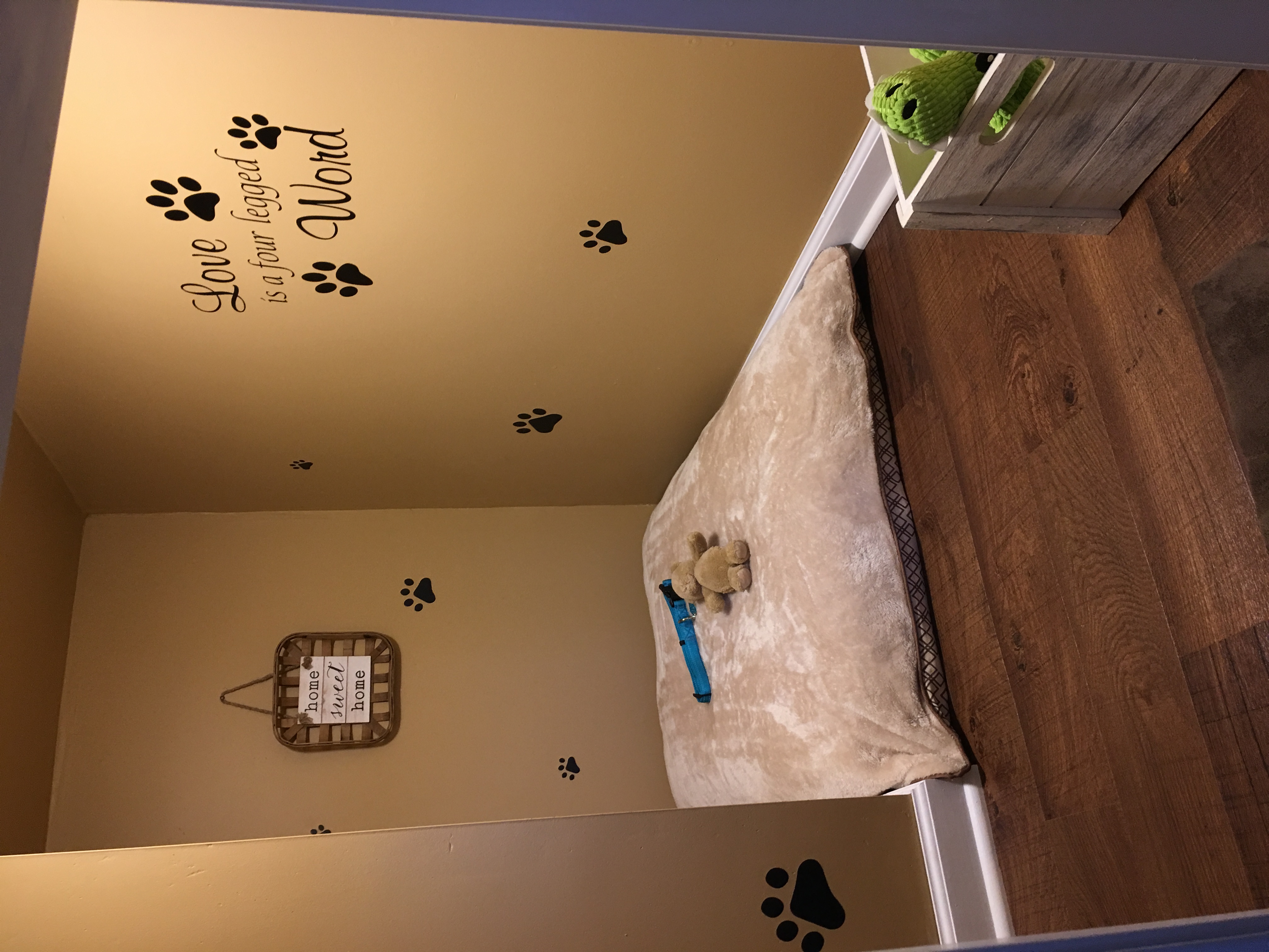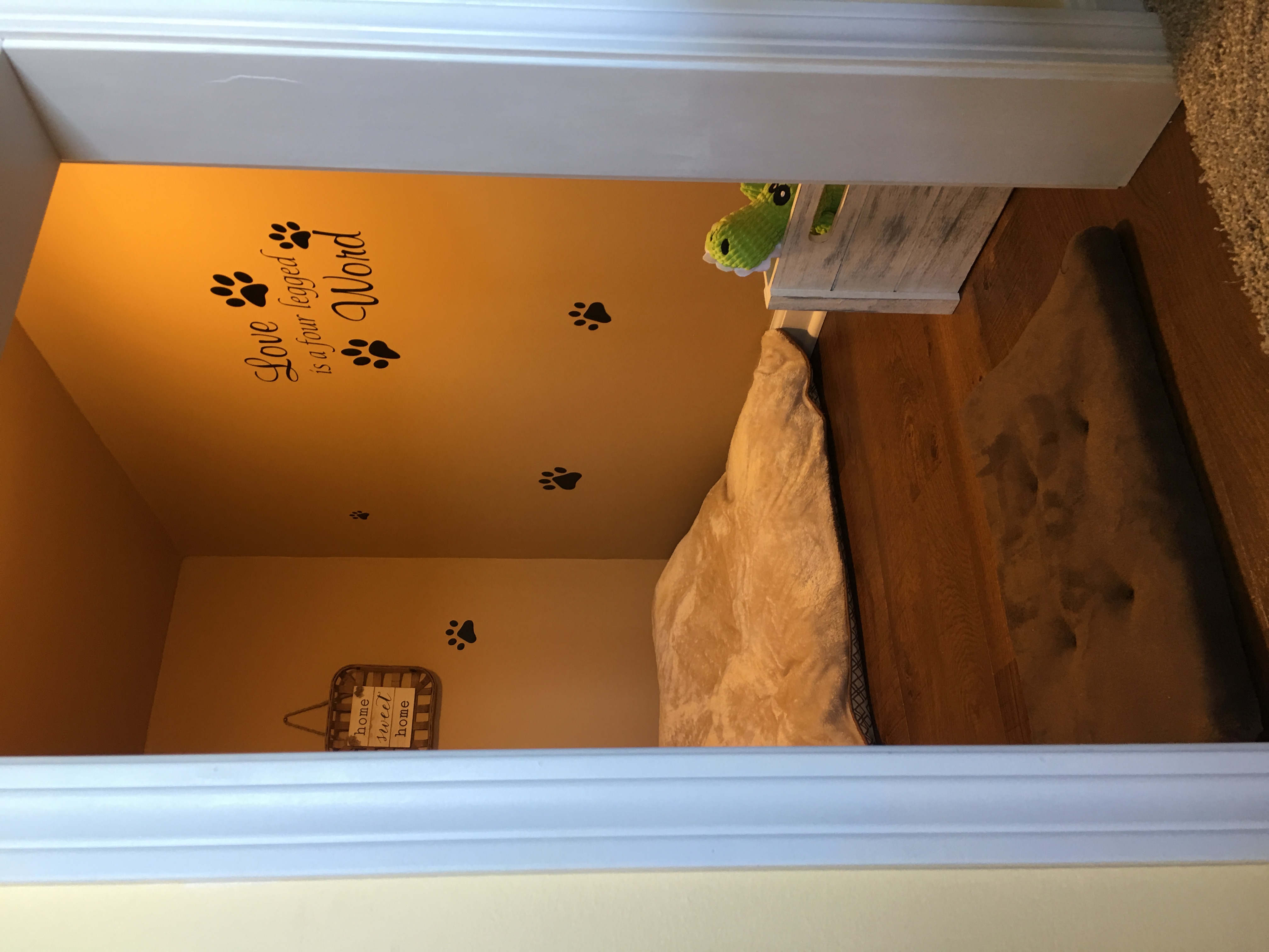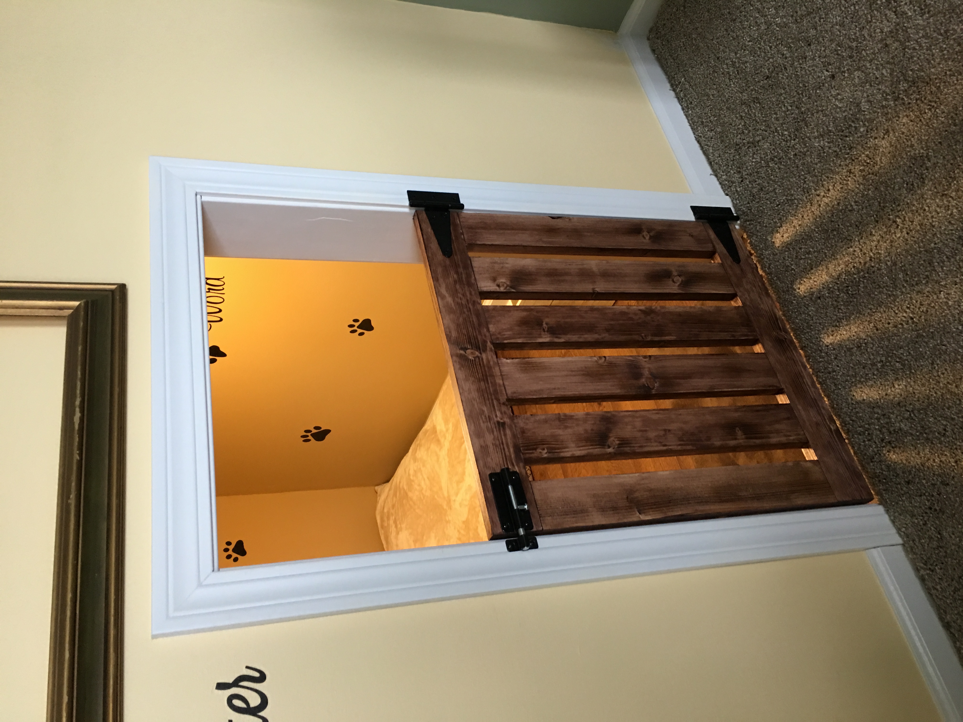 Crawlspace under stairs converted into dog den