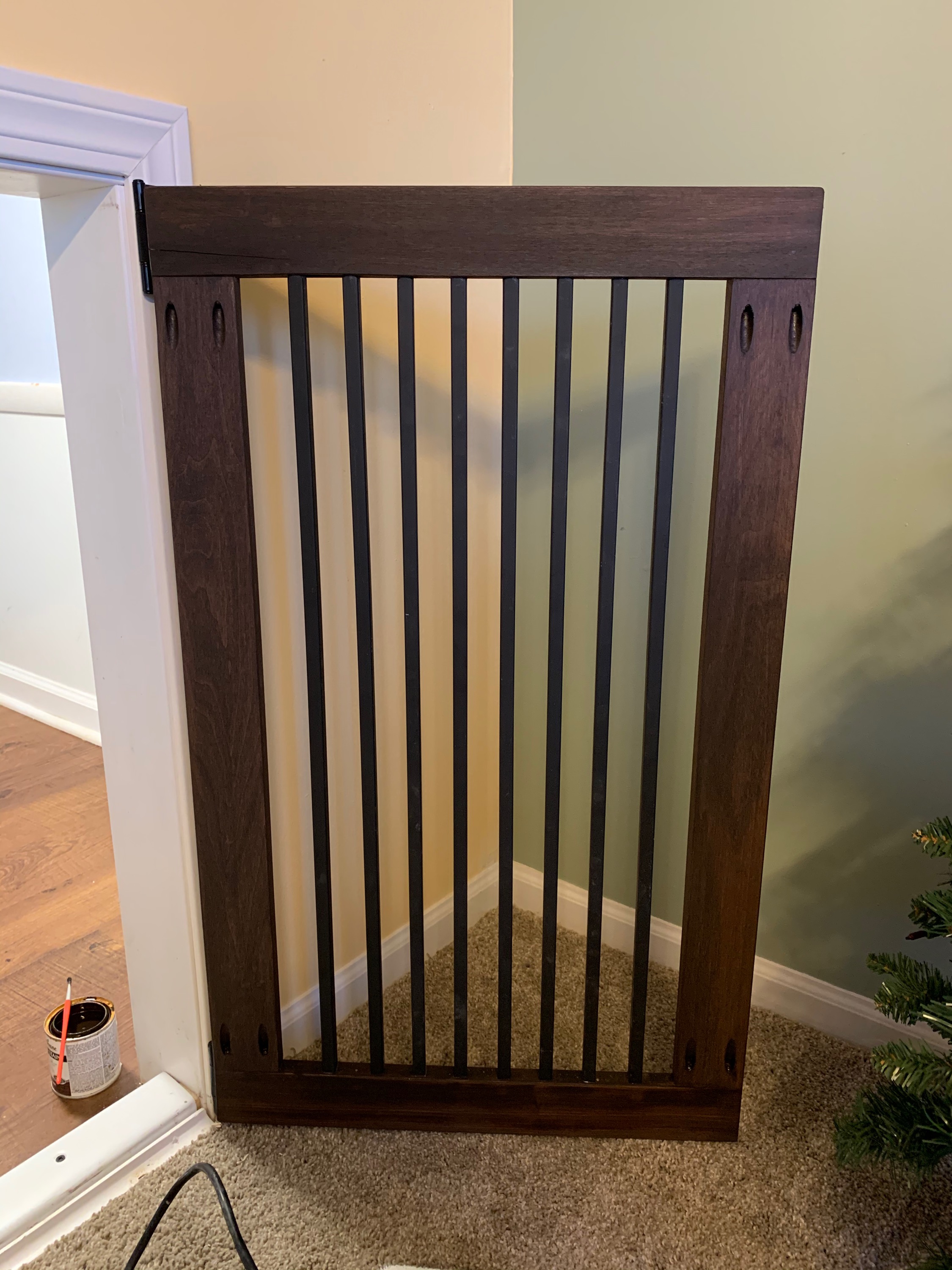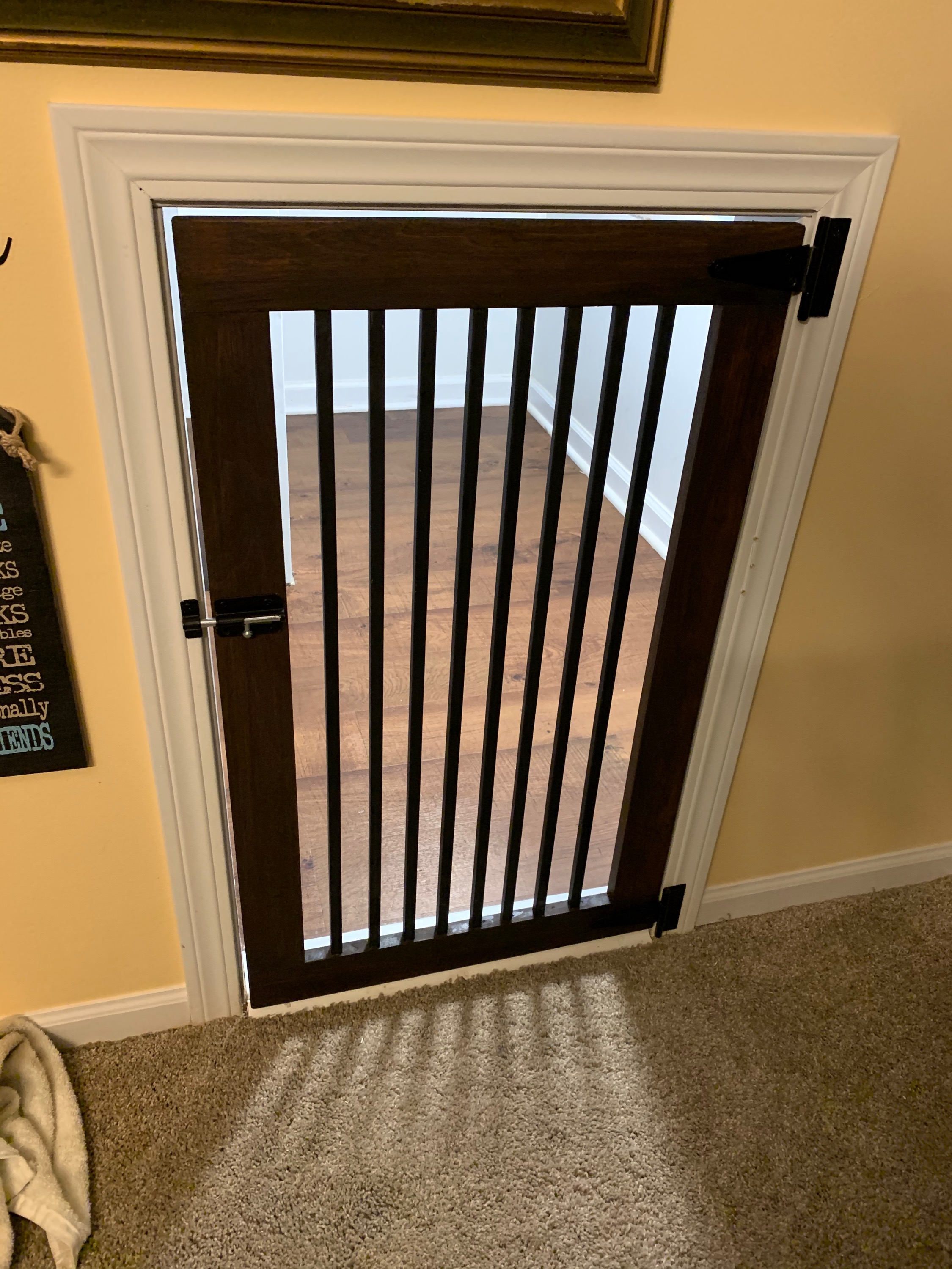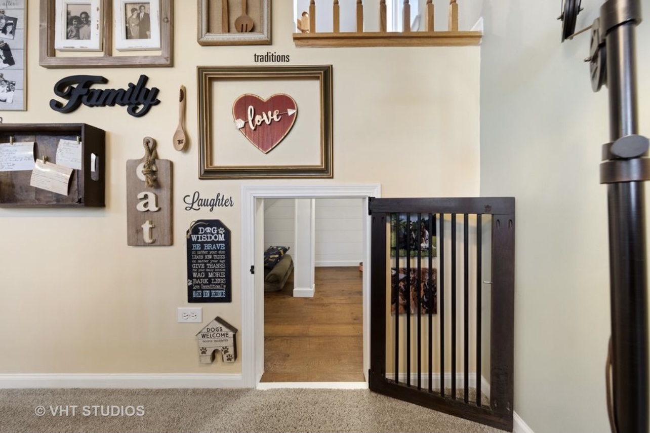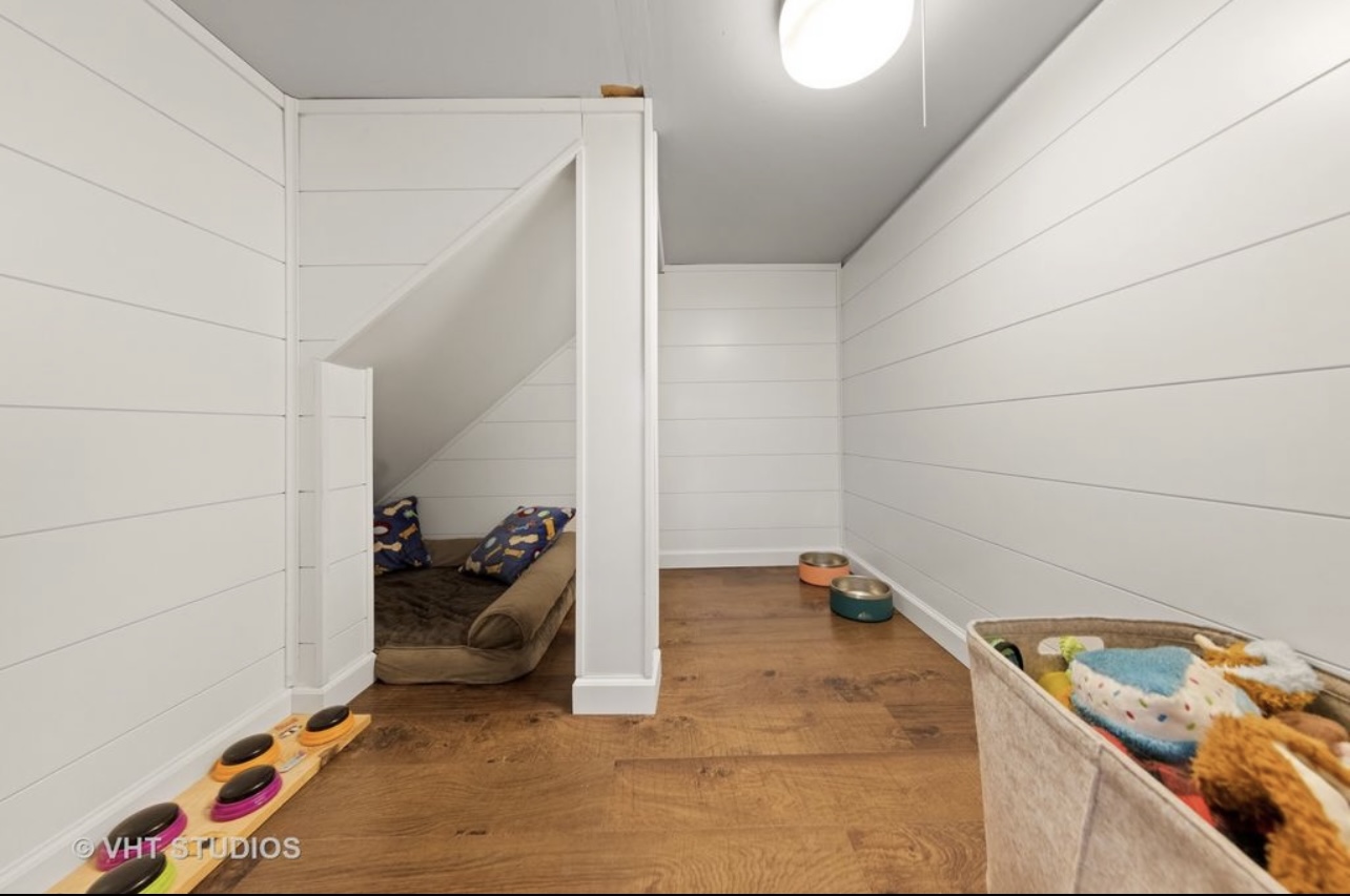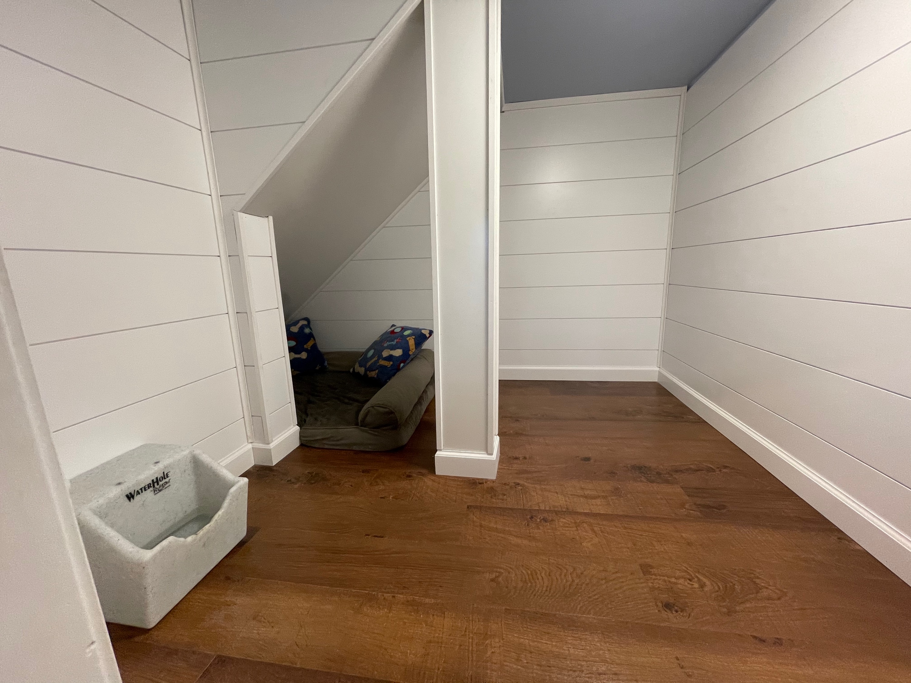 Crawlspace under stairs converted into dog den